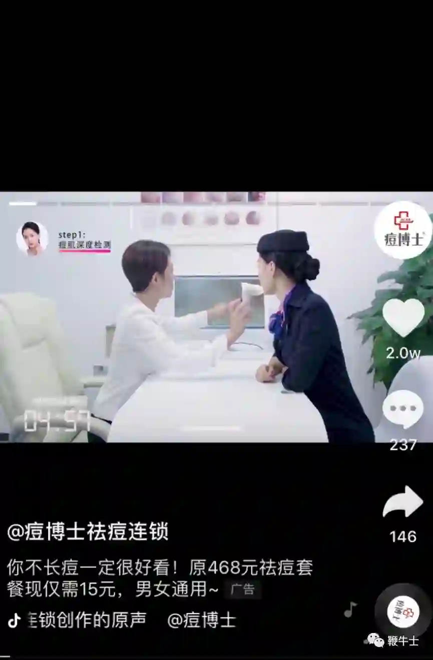 近日有用户在某三线城市刷抖音时刷到祛痘机构“痘博士”的广告,该用户还表示在知乎的信息流中也看到该广告。