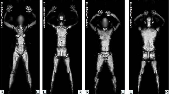 上图为人体扫描的结果,类似于人们在机场所经历的情形。即使是最强烈的X射线,在扫描时也只相当于几个秒剂量的级别。大剂量的扫描会对人类或任何生物体造成极大的危险。(图片来源:交通安全管理局)