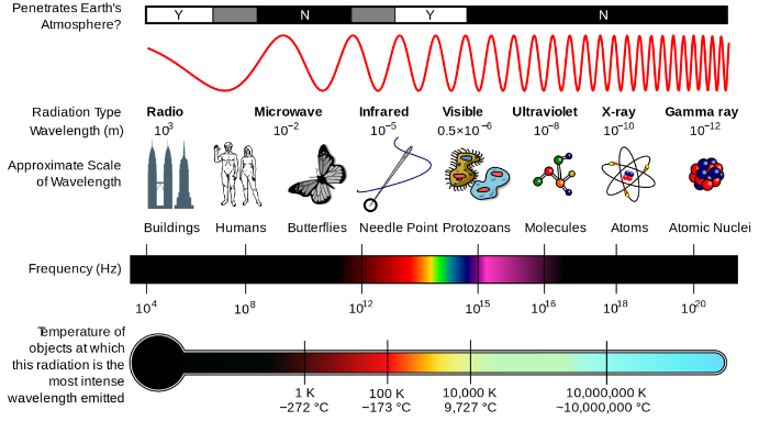 在上图中,你可以看到电磁频谱。虽然你通常只知道你与光(可见光部分)和红外(热)辐射的相互作用,但实际上还有更多的东西在不断地与你的身体相互作用。