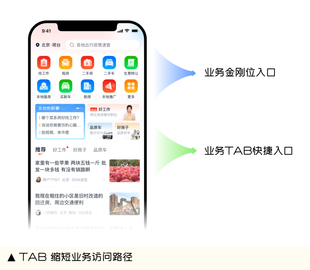 新用户浏览路径较短,不容易接受相对复杂的浏览路径。如果使用深度用户的浏览路径,新用户很难完成复杂操作,极易中断浏览。因此针对新用户通过将路径较深的金刚位二级、三级业务列表,调整在首页一级列表中进行展示,采用简单的Tab横划操作,直接缩短浏览路径。