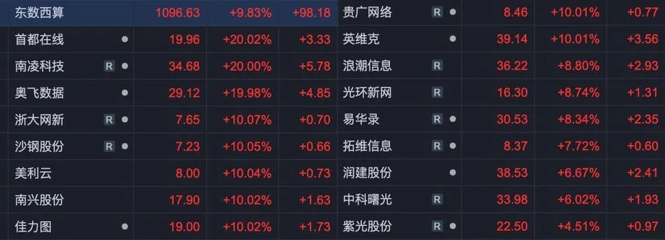 A股市场的50只“东数西算”概念股集体上涨,当日收盘涨停个股达到24只。