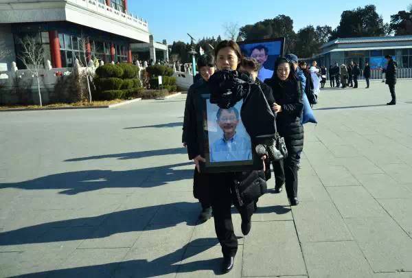 2015年1月16日北京,“布鞋院士”李小文追悼会在八宝山殡仪馆举行,他的女儿带着遗像走向焚烧处