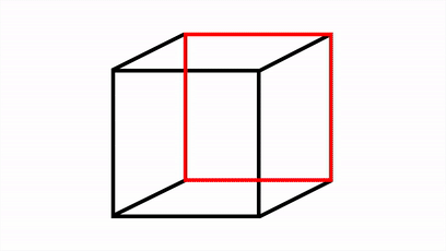 没看出来?这确实需要一点想象力。当虚线变成实线,立方体的朝向就开始存在一种模糊性,它有可能朝向「右上角」,也有可能是朝向「左下角」。
