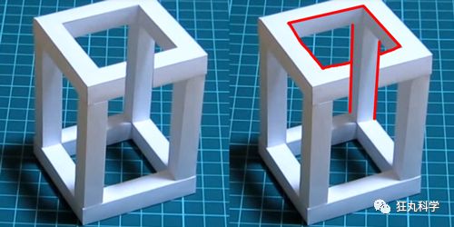 它的有趣之处在于,三个角貌似都是直角,而且扭曲了空间: