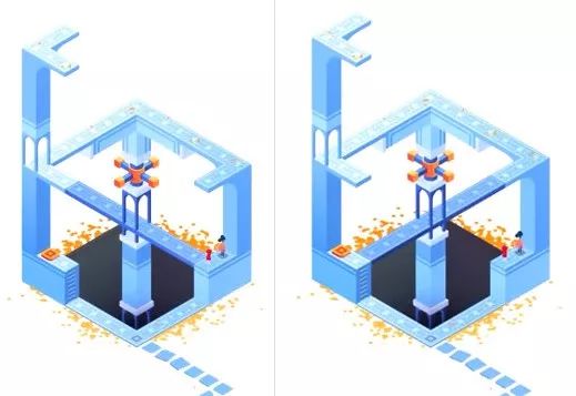 和你在游戏中的解谜方式一样,《纪念碑谷》调整了画面观看角度,帮助玩家直接省略这部分路径,完成了一个看似合理但其实在「忽悠」人的视错觉画面: