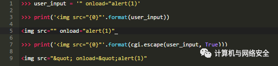 下面一个例子展示了将双引号替换的理由。在第一个打印语句中用户输入增加了一个新的属性,在第二个将引号替换防止用户输入插入一个新的属性。