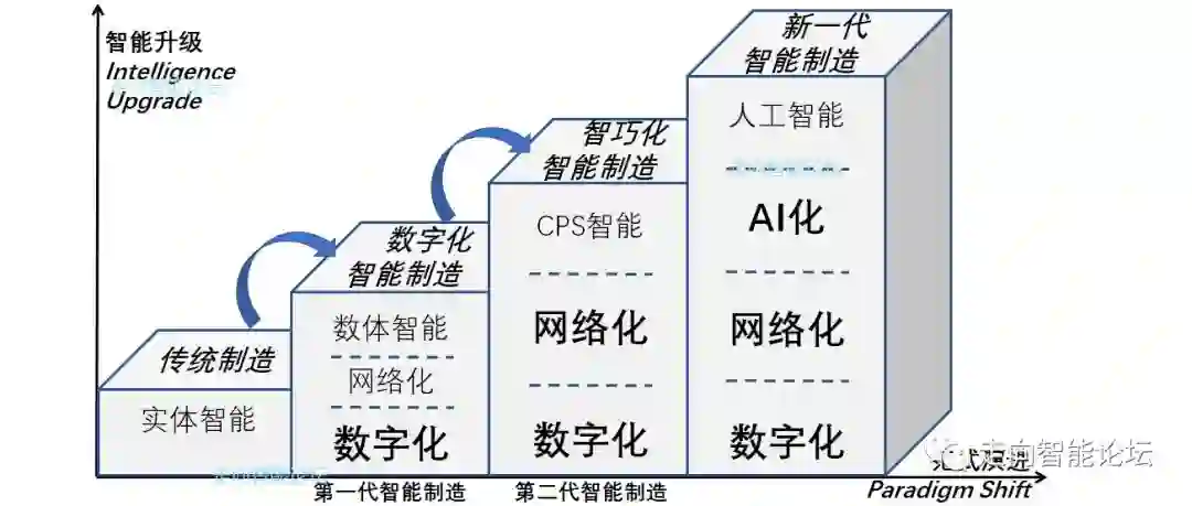 在这样一个漫长的“智能化”演变过程中,建议将智能制造三个范式命名为:以数体智能技术为主的“数字化智能制造”,以CPS能技术为主的“智巧化智能制造(Smart Manufacture - SM)”,以人工智能技术为主的“AI化智能制造(Intelligent Manufacture - IM)”。