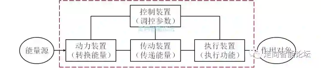 “执行装置”(即执行器)负责发出动作,执行系统的预定功能;“动力装置”负责产生、转化能量;“传动装置”负责传递能量;“控制装置”负责调控各个子系统的运行参数,让执行装置尽量精确地做出所需动作。当人造系统实现预设功能时,“动力装置、传动装置、执行装置、控制装置”必须同时存在,完整无缺,协调作用,才能实现人造系统预设功能。