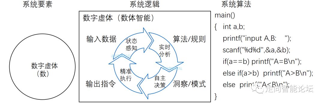 数字虚体之间的相互作用是赛博空间(或数字世界)常态。计算机软件、硬件和网络之间的互动构成了数亿条代码写成的大型软件、工业互联网平台、工业云等复杂而庞大的数字世界。数体智能是实现智能制造第一范式“数字化制造范式”的技术要素。其发展演进后的高级状态,是在特定算法的支持下,逐步演进到人工智能。