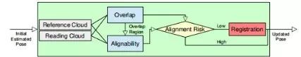 第四篇提出一种预测和防止激光定位失败的策略。我们解决的方法是在匹配前对点云的内容进行明确分析。通过分析两个输入点云之间的空间重叠程度和重叠区域内可用的几何约束来学习预测误对准概率的模型。我们为这些约束定义了一种新的可对准性的度量。该方式对三个真实世界的数据集进行评估,并和基准的方式进行比较。实验证明我们的方法如何在未知和杂乱的人造环境中提高激光定位的可信度。