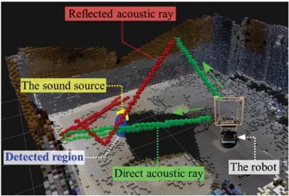 第一篇文章提出了一种新型的用于室内环境中的3D声源的反射定位的方法。与现有方法不同,现有方法主要基于来自固定源的连续声音信号,本方法设计从单帧信号中定位即时位置。我们考虑了经过如天花板或墙面等表面反射后到达麦克风的直接或间接的声音信号。然后使用逆声线追踪生成并跟踪直接或反射的声波路径,通过蒙特卡洛定位方法利用这些路径来估计3D声源的位置。我们将该方法应用于一个配备了立方体形状的麦克风阵列的机器人上,并在固定和移动的声源下在连续的和间隙的声音信号下进行了不同设置的测试。在不同的设置下,该方法能在7m×7m×3m的室内测试环境下定位声源,平均距离误差为0.8m,包括移动和非视距声源。我们也发现,在加入对间接射线的建模能比仅用直接射线的建模方法提高40%的定位精度。