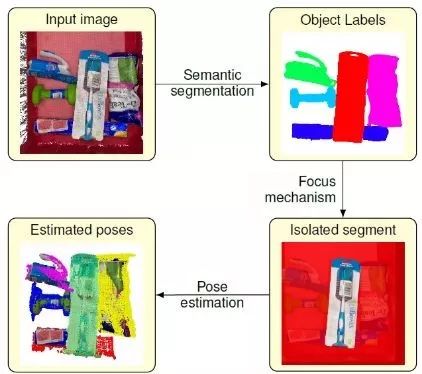 第二篇文章提出了一种需要最少人为干预的方法,并通过快速数据采集方法和合成数据生成程序避免了对三维模型可用性的依赖。这项工作建立在先前关于杂乱拾取场景语义分割工作的基础上,以便在杂乱环境中隔离单个对象。并在合成场景上训练一个额外的网络,以根据从分割结果中提取的以对象为中心的编码来估计目标姿态。