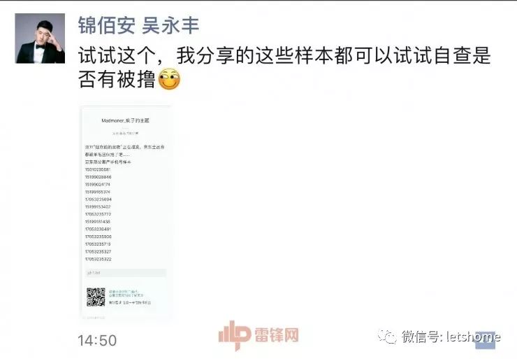 10月31日,宅客频道从朋友圈看到,锦佰安公司业务安全部总监吴永丰称:“双‘11’狂欢前的黑夜正在爆发,京东全品券都被羊毛团伙抢了吧”,并附上了部分黑产手机号样本。