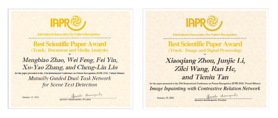 【导读】日前,国际模式识别大会(ICPR 2020)以线上形式召开,各奖项评选结果在大会中正式发布,自动化所共斩获大会五项最佳学术论文奖( Best Scientific Paper Award)中的两项。同时,大会也为入选IAPR Fellow的自动化所蒋田仔研究员、赫然研究员正式颁发证书。下面,将与各位分享此次获得ICPR最佳学术论文奖的两篇文章。