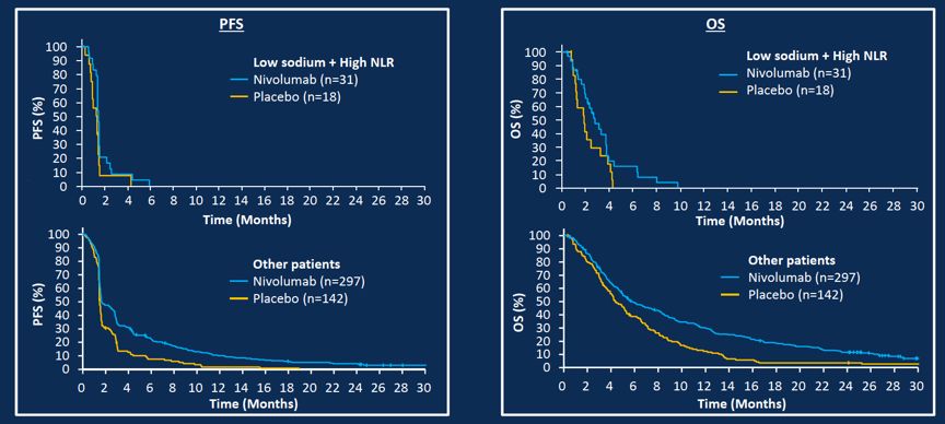 在配对因子分析中,低钠血症和以下任意一个因子组合,都是纳武利尤单抗早期进展的危险因素,包括高NLR(N = 31,9.4%;界值,第2三分位)、中性粒细胞升高(N = 28,8.5%;界值,第2三分位)、PS 1分 (N = 50,15.2%)或既往未使用过雷莫芦单抗(N = 55, 16.7%)。上述任意2个因素配对的患者中,纳武利尤单抗组和安慰剂组的PFS曲线几乎重叠。图2显示,同时存在低钠血症与高NLR两个因素,纳武利尤单抗组和安慰剂组的PFS和OS率只略有差别。