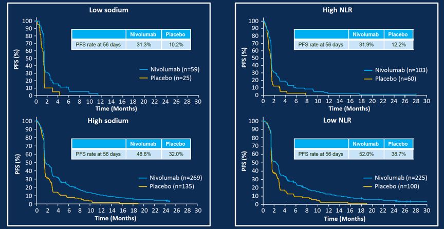 纳武利尤单抗组的330例患者,59例在基线时表现为低钠血症。单因素分析显示,低钠血症是预测早期进展的最强预测因素,如图1所示,低钠血症患者56天的PFS率对比,纳武利尤单抗组和安慰剂组分别为31.3%和10.2%。