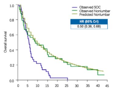 校正Flatiron Health数据库随机队列患者的协变量后,接受纳武利尤单抗治疗患者预估的生存期与CheckMate 032中实际观察到的生存期相似。基于模拟治疗比较法,接受纳武利尤单抗治疗预估的生存期对比Flatiron Health随机队列中观察到的生存期,提示纳武利尤单抗较标准治疗改善总生存(HR = 0.50;95% CI 0.36~0.68)(图5)。这与ATTRACTION-2研究中死亡风险降低37%的结果一致。鉴于尚无研究针对西方人群比较纳武利尤单抗与-标准治疗的随机对照研究,该研究的结果对于临床实践具有重要的启示意义。
