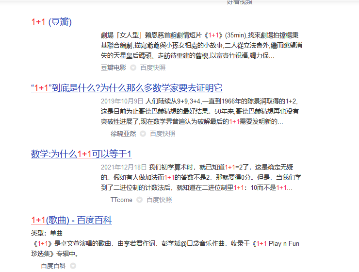 当你搜索1+1时,首屏上80%的搜索结果,不是1+1=2,而是哥德巴赫猜想、电影、歌曲之类与1+1相关的东西,甚至关于1+1=1的推论。
