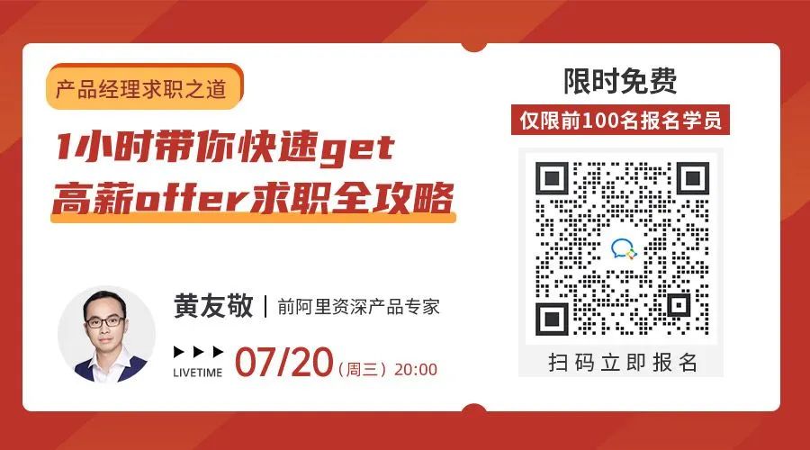 下周四(7月20日)晚8点,前阿里高级产品专家@黄友敬老师,将用1小时带你快速get高薪offer求职全攻略,他会站在面试官的角度多维度剖析产品求职难题,破解面试官问题背后的“套路”,助你顺利拿到offer!