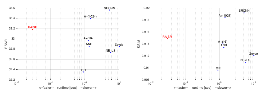 下图为RAISR在2x上采样率时与SRCNN,A+等超分辨算法的技术指标对比。左为PSNR-runtime指标,右图为SSIM-runtime指标。