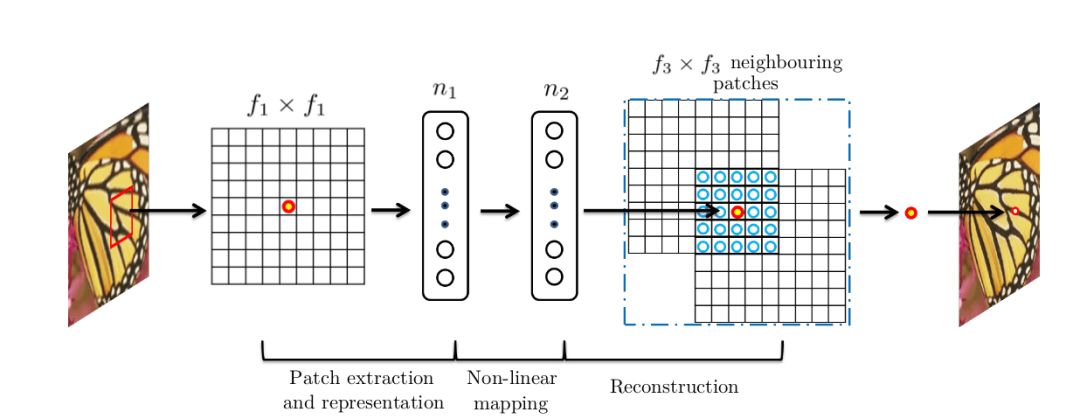SRCNN【1】是基于深度学习的超分辨重建领域的开山之作,继承了传统机器学习领域稀疏编码的思想,利用三层卷积层分别实现: