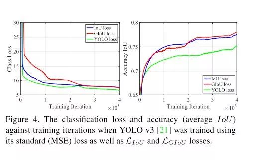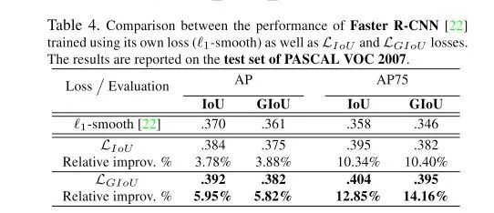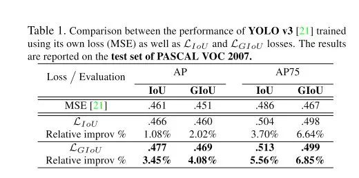 作者做了一系列的实验(针对分割任务和分类任务有一定 loss 的调整设计,不过论文中没有详细给出)结果是 IoU loss 可以轻微提升使用 MSE 作为 loss 的表现,而 GIoU 的提升幅度更大,这个结论在 YOLO 算法和 faster R-CNN 系列上都是成立的: