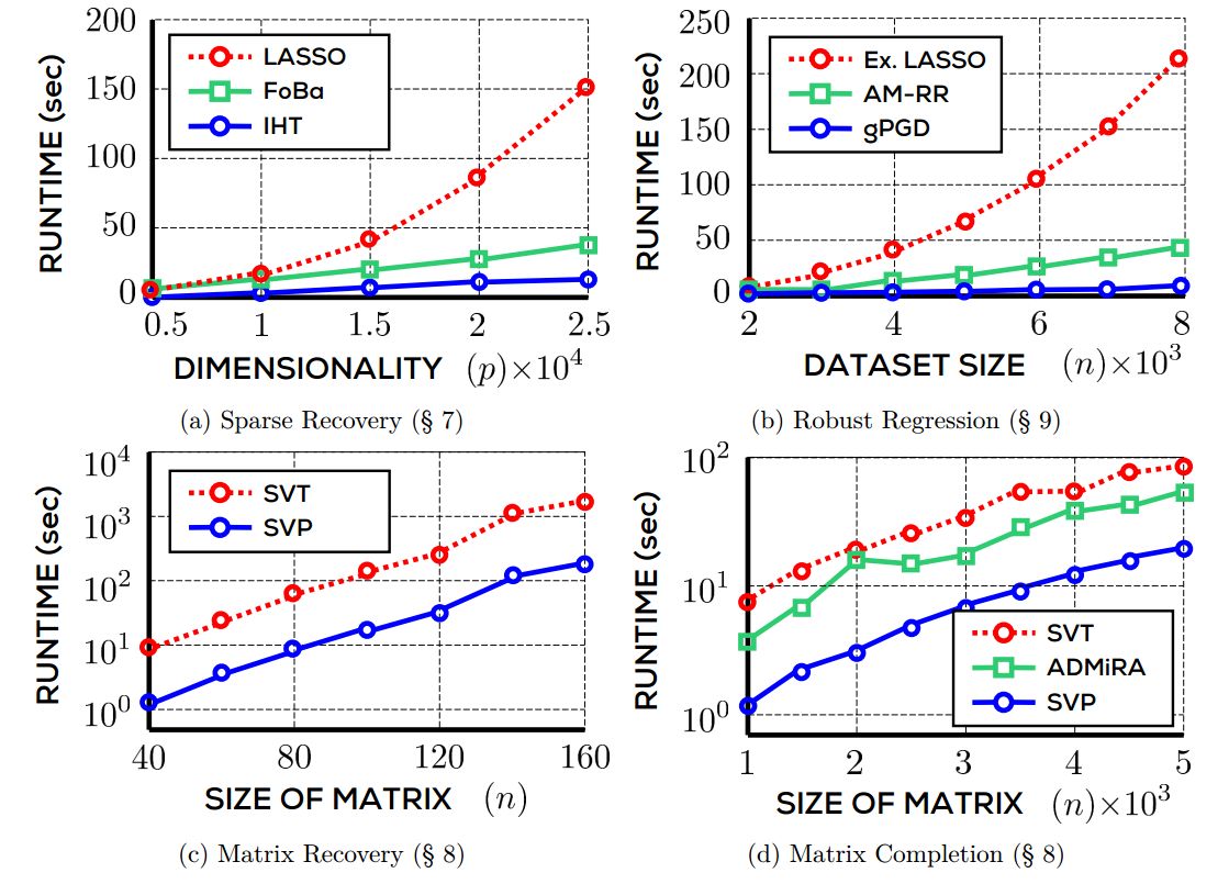 图 1.3:不同方法在四个非凸优化问题上的运行时实验对比。LASSO、extended LASSO 和 SVT 是基于松弛的方法,IHT、gPGD、FoBa、AM-RR、SVP 和 ADMiRA 是非凸方法。在所有情况中,非凸优化技术比基于松弛的方法快出一个数量级。注意图 1.3c 和 1.3d 使用对数尺度的 y 轴。