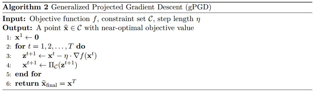 算法 2 概述了用于解决非凸优化问题的广义投影梯度算法(gPGD)的过程。读者将会发现这非常类似于算法 1 之中的 PGD。然而,一个关键的区别是所做的投影:PGD 利用了凸投影,而 gPGD 利用了非凸投影(如果涉及到一个非凸约束集 C)。