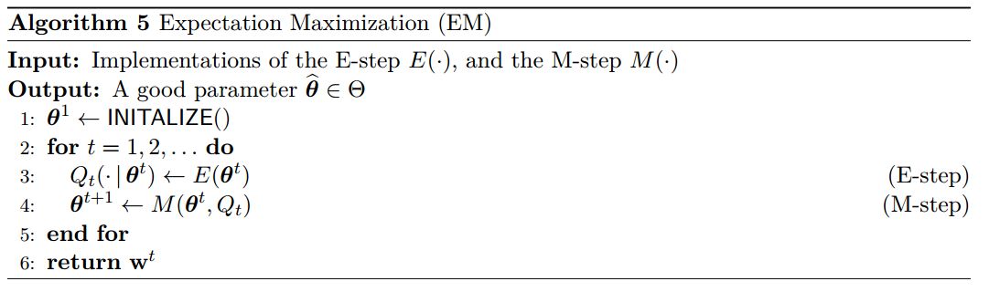 算法 5 给出了 EM 算法的整体框架。实现 EM 算法需要两个过程,其一是构造与当前迭代(期望步骤或 E 步骤)对应的 Q 函数,另一个是用于最大化 Q 函数(最大化步骤或 M 步骤)以获得下一迭代。