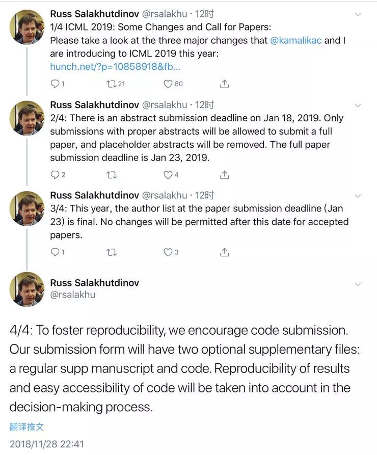ICML 2019 大会将于 6 月 10 日至 15 日在加州长滩举行,比去年早了一个月。鉴于往年投稿数量多、审稿人水平参差不齐的情况,为了鼓励论文内容的可重现性和论文的高质量提交,ICML 2019 的程序主席之一 Ruslan Salakhutdinov 教授在 twitter 表示,今年将会对论文提交增加三个新要求: