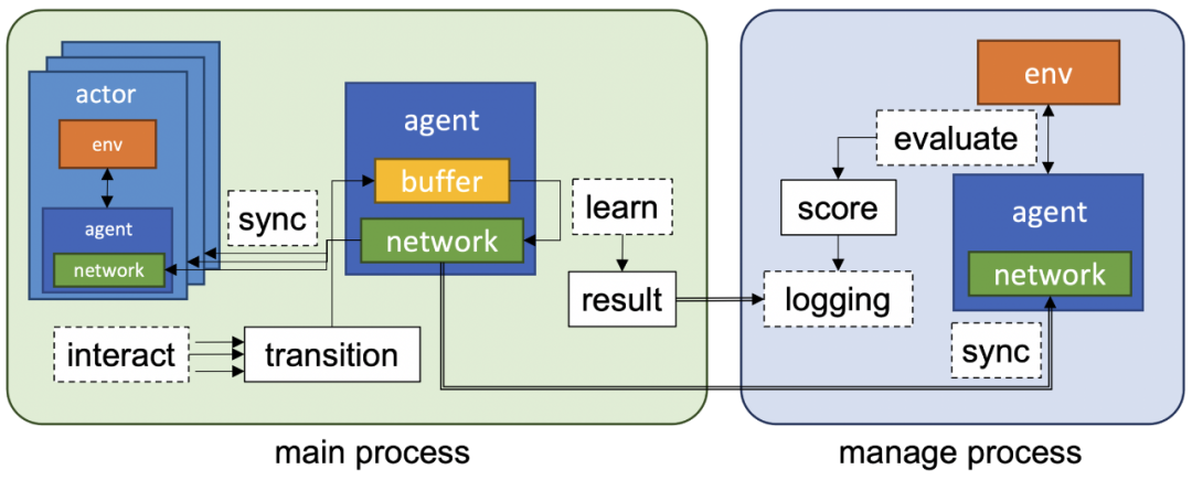 单个参与者训练脚本中包含主进程和管理进程。在主进程中,单个智能体与环境交互以收集转移(transition)数据,并借助这些数据训练网络。在管理进程中,使用最新的网络进行评估得到一个分数,并在主进程中记录这个分数和训练结果。训练流程如下图所示: