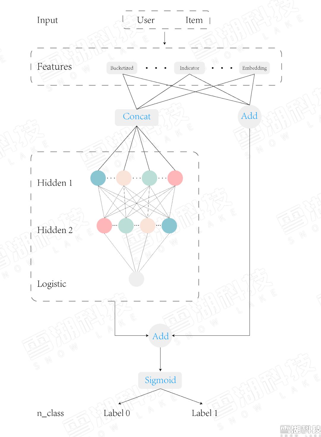 Wide&Deep 虽然效果很好,但是随着算法的不断迭代基于 Wide&Deep 模型思想,有很多新的模型被开发出来,基本思想是用 FM、FFM 代替 LR 部分,通过串联或者并联的方式与 DNN 部分组合成新的模型,例如 FNN,PNN,DeepFM,DeepFFM,AFM,DeepCross 等等,雪湖科技公司也致力于将所有 CTR 预估模型都完美兼容,在保证精度的前提下,增大吞吐量。