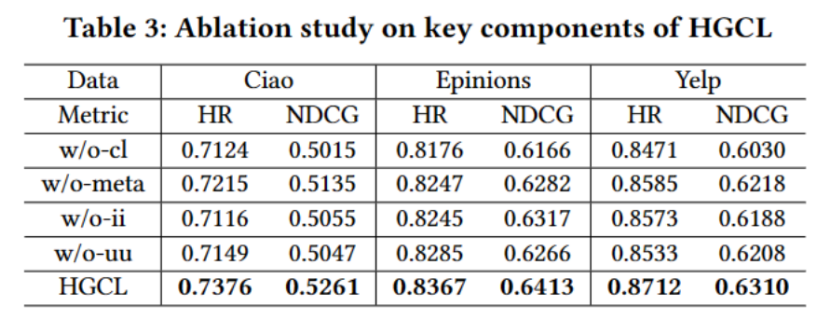 从对比结果来看,引入自监督学习方法(如 Heco, MHCN, SMIN)可以使模型的效果得到提升,而本文所提出的 HGCL 相比较于使用传统的对比学习方法,推荐性能进一步提升,也表明了本文所描述方法的有效性。我们做了消融实验来进一步验证引入特定化的异构图对比学习方法是必要的且有利于模型效果的提升。