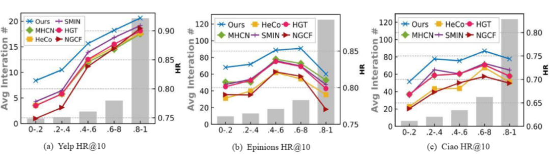 实验结果图清楚地表示了我们模型在不同数据稀疏情况的较好的模型表现,模型效果的优越性可能来自于模型中基于跨视图知识转换的对比学习的作用,因为它可以有效地捕捉到特定于用户的社交关系的影响和特定于商品的语义相关性。