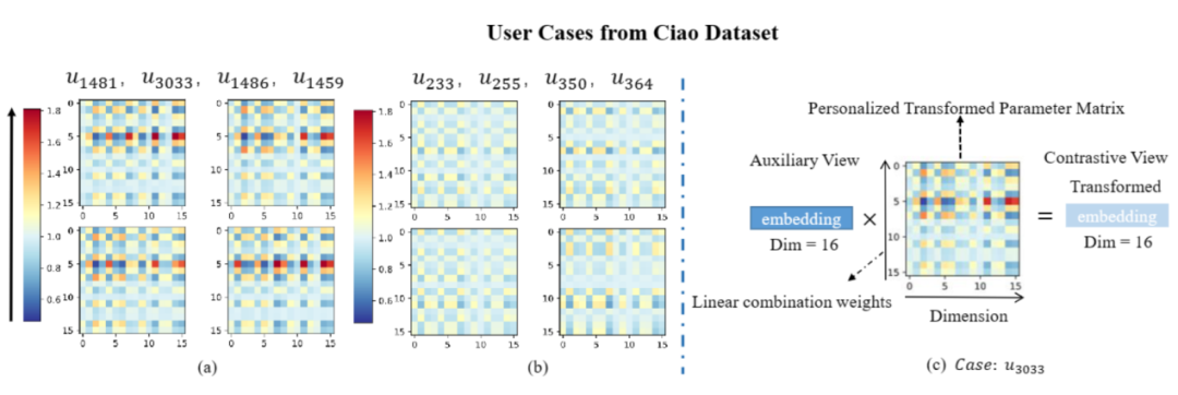模型通过结合异质图对比学习和元神经网络,实现了自适应的跨视图对比数据增强,以适应用户个性化的特质。实验结果表明,模型能够成功捕捉用户之间的差异,并根据这些差异进行相应的调整数据增强,从而进一步提升推荐性能。