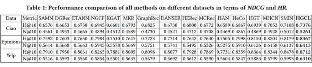 在三个常用的数据集(Yelp、Epinions 和 Ciao)上,我们进行了实验,并与多种类型的推荐算法模型进行了比较。