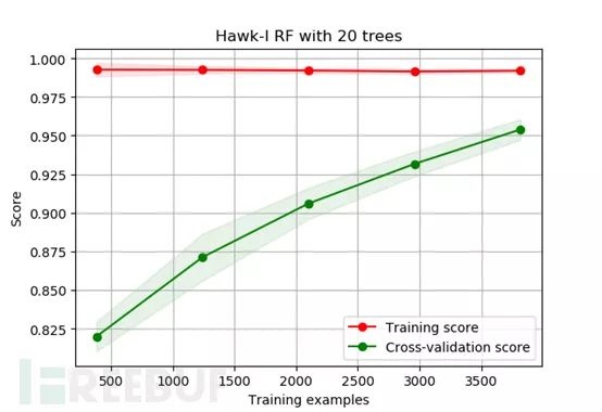 这些特征向量能否充分反映样本的异常性呢?我使用未调参的随机森林模型进行验证,得到了大于95%准确率的结果,比较满意。下图是模型学习曲线,可以看出仍处于欠训练的状态,如果样本量更充足的话将会得到更好的效果。