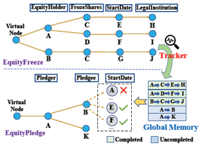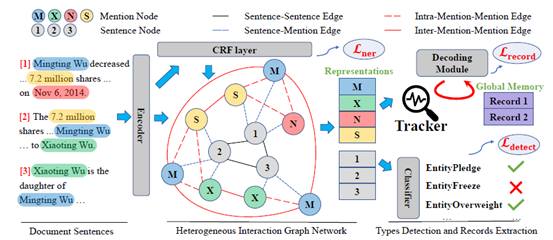•按照给定事件类型逐个抽取事件(例如,先抽EquityFreeze类型,再抽EquityPledge类型),按照给定角色顺序逐个抽取属性(在EquityFreeze类型的事件中,角色抽取顺序为EquityHolder、FrozeShares、StartDate…)•构建tracker实时记录当前抽取情况,存入memory,并在当前角色的属性预测过程中将memory中的信息考虑进来。具体而言,当前角色属性抽取考虑的因素包括