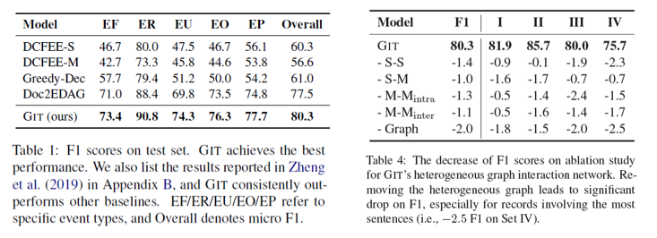 本文提出的Graph-based Interaction Model with a Tracker (GIT)方法基于异质图网络完成篇章内句子、实体提及之间的交互,并引入tracker跟踪预测事件记录以及role对应抽取记录。试验证明它能增强实现篇章理解和事件关联建模。