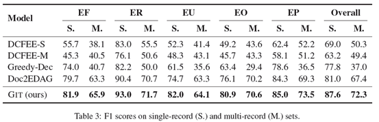 实验在中文金融事件抽取数据ChFinAnn上进行,结果表明GIT方法在该数据上达到SOTA;在单事件和多事件情况下表现都能显著提升,基于GNN的异质图编码对文档理解充分、基于tracker的事件关联建模能增强多事件表现等。