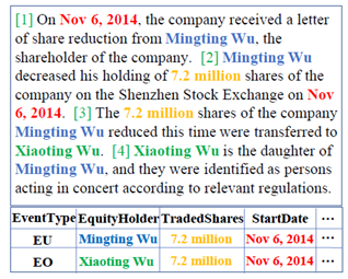 篇章事件抽取问题的挑战包括事件属性分散(EO事件中,“Xiaoting Wu”出现在句子3和句子4中,“Nov 6, 2014”则出现在句子1和句子2中)和多事件(关联性事件“股票增持”和“股票减持”)。现有方法DCFEE、Doc2EDAG等一般独立地抽取事件,忽略它们之间内在关联性。