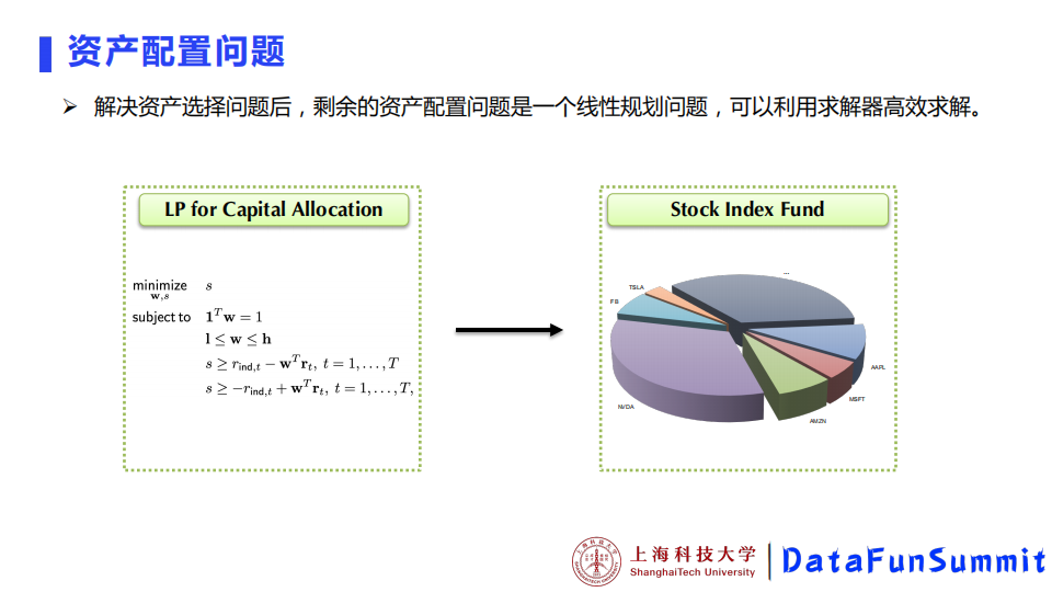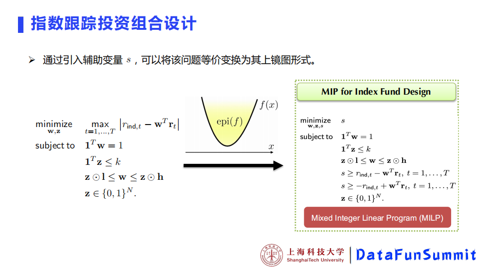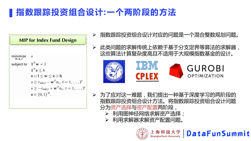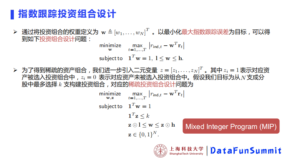 这个就叫做一个混合整数规划问题,看起来比较难一点,并且它的难点不光是这个问题本身比较复杂, 还有n的规模会非常大。比如要对两个市场进行跟踪,那可能就有几千甚至上万只股票。但是k又往往比较小,因为我们总是不希望资产组合中投资太多这样的底层资产。所以对于这样的问题,它的计算复杂度也是非常高。