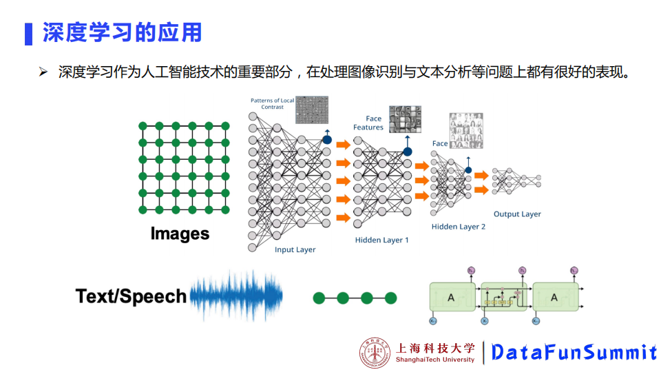 深度学习现在是人工智能非常重要的一部分。比如在图像领域,比较经典的卷积神经网络,它在分析音频领域会有一个基于循环神经网络的LSTM这样的结构,这些都是非常有代表性的深度学习的模型。