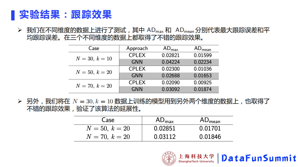 我们通过CPLEX产生的数据训练模型,最后把得到的模型跟业界中应该会用到的CPLEX的模型进行对比。这里用了两个指数跟踪误差,最大的误差和平均误差进行比较。可以看到模型的最后表现跟标准的方法是很接近的。