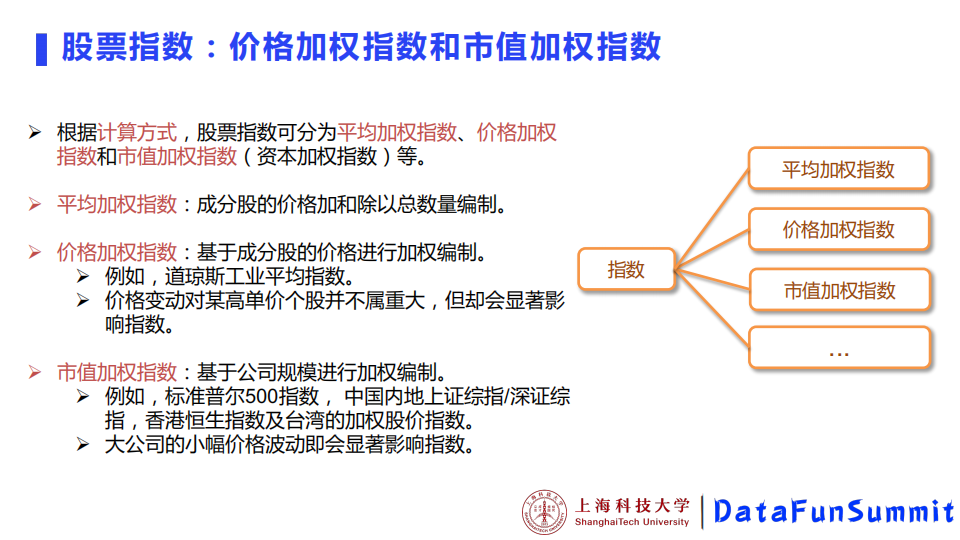 市值加权指数:基于公司规模进行加权编制,大公司的小幅价格波动机会显著影响指数。例如,标准普尔500指数、上证综指、深证综指、恒生指数等。这个编制方式更自然一点,因为考虑到大公司对于整个市场的影响更大一点。