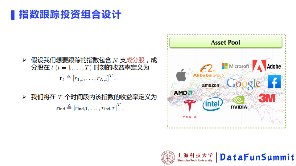 如图右侧这样一个资产池是我们感兴趣的某个指数的成分股,我们把每只股票在某一天的收益率用一个rt表示,同时也可以把指数的收益率用rind示出来。