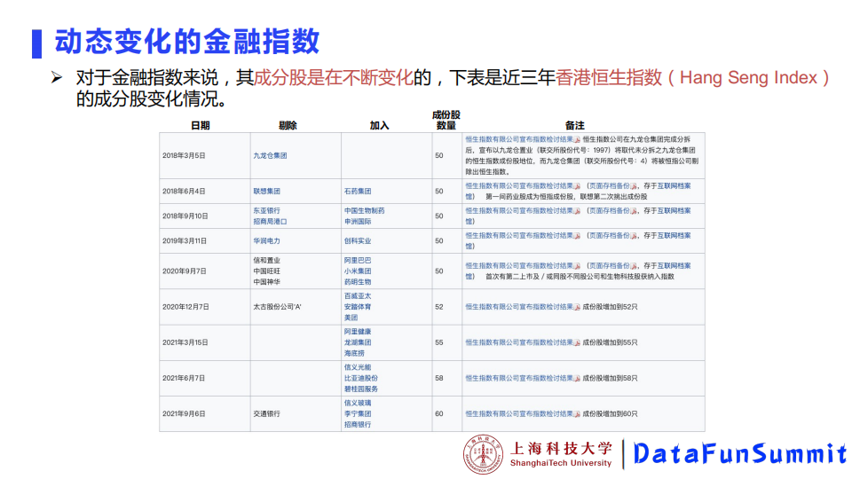 对于一个金融指数来说,因为它的成分股是在不断变化的,因此我们想要把它建模成图。图中下方展示的是香港恒生指数近三年来的成分股的变化情况,可以看出不断有一些股票被剔除出去,也有一些被加入进来。那么对于一个图来说,就可看成这个图中有一些节点会消失,有一些会产生新的节点,并且这个图的大小是在不断变化的。成分股的数量也从最初的50只逐渐变到了现在的60只,所以这是一个很自然的图的结构。