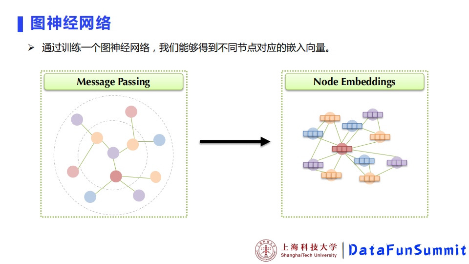 有了这样一个图的表示之后,会得到一个计算图,如图左侧。在这个计算图中,可以通过信息传递得到每个节点的嵌入,节点嵌入其实就是一个向量。