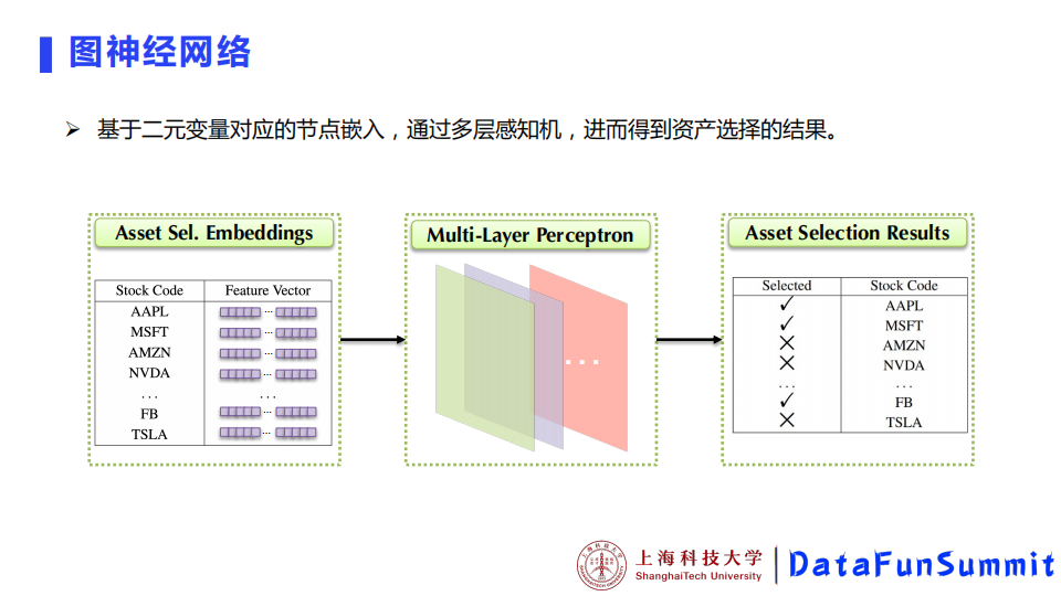 然后这个嵌入通过多层的感知机的结构,输出一个我们想要的二元变量。如果这个二元变量是1,就代表在投资组合中要去买这个资产;如果是0,则代表资产没有被选入投资组合中。