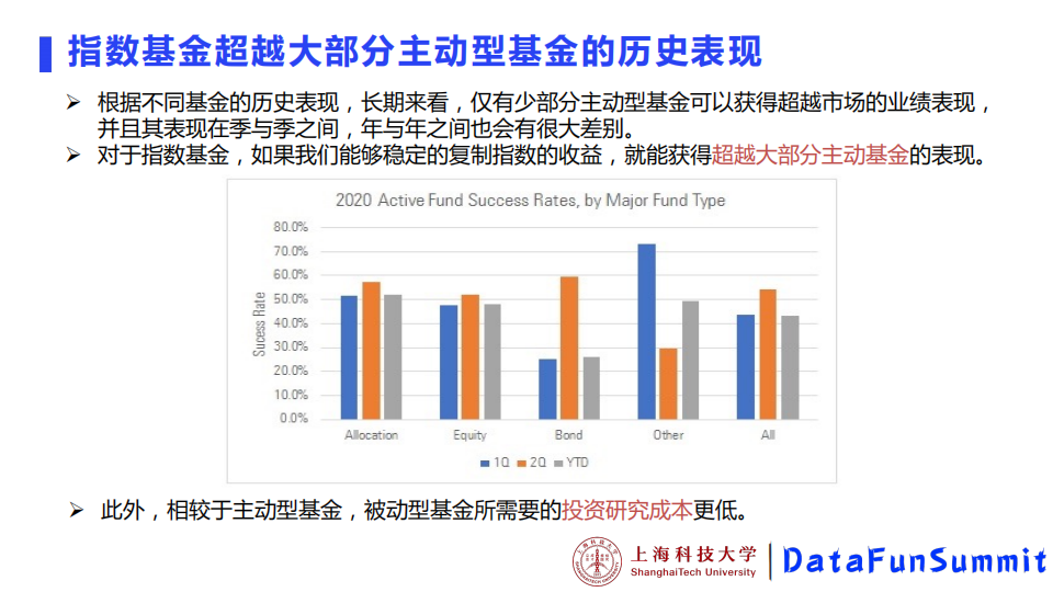 大部分的主动型基金波动性会比较大,当我们回顾历史数据,长期来看主动型基金很难去超越指数基金。这个结果符合有效市场假说,在美国的资本市场可能会更明显一点。